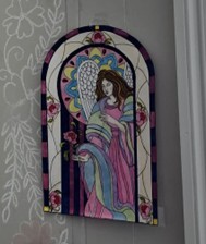 Lighting: The lighting of the room is not sufficient to display the wonderful iridescent paint used. We have arranged to have a light installed on top of the painting so that the full effect can be achieved.