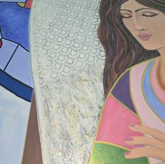 Heavy body interference acrylic paints, iridescent mediums using colour shift acrylics in pearl colors and glaze, and metallic art pens were used to create movement and add shine to the painting.